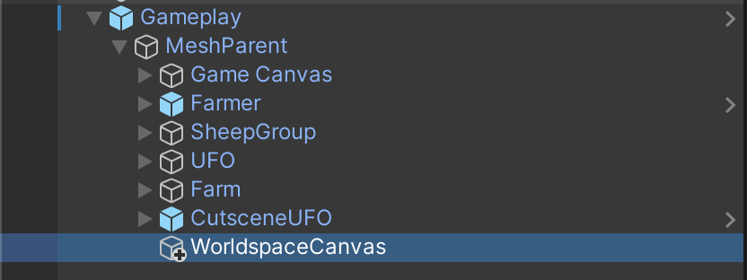 2. Create a new UI > Canvas GameObject as a child of the MeshParent GameObject. Name the UI Canvas “WorldspaceCanvas” or something similar.