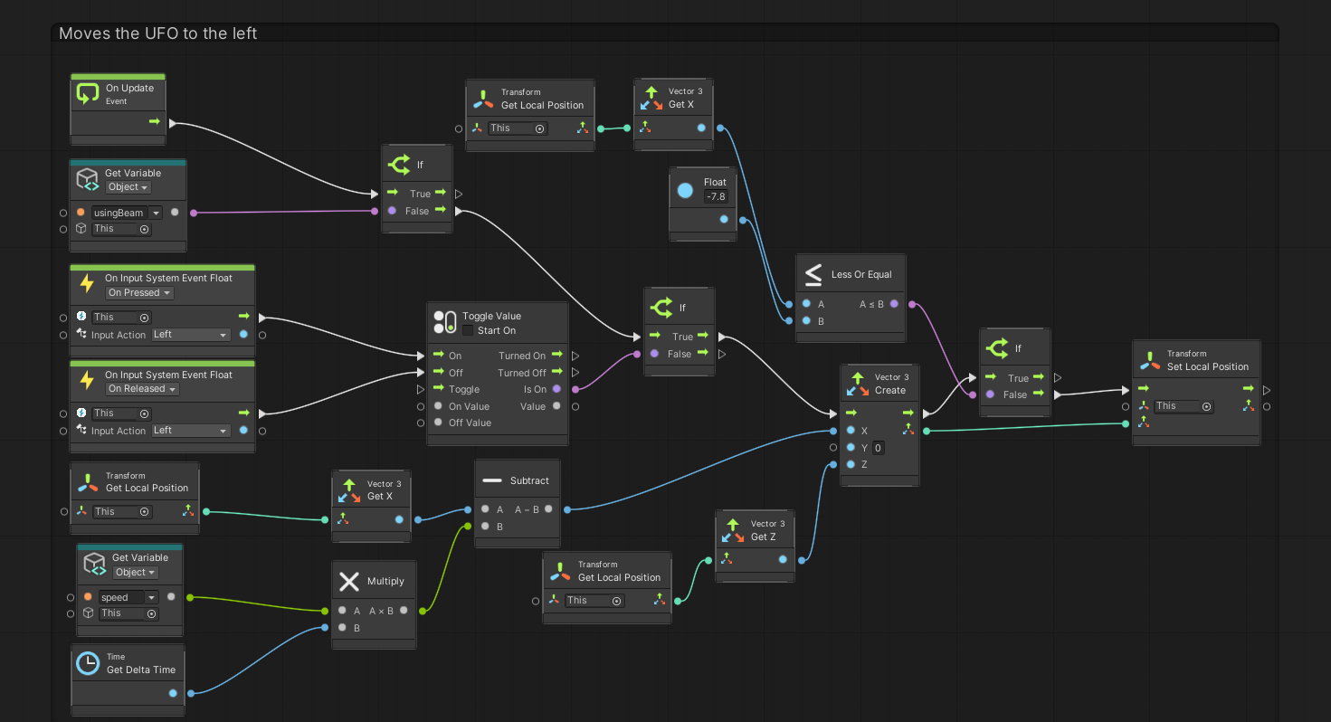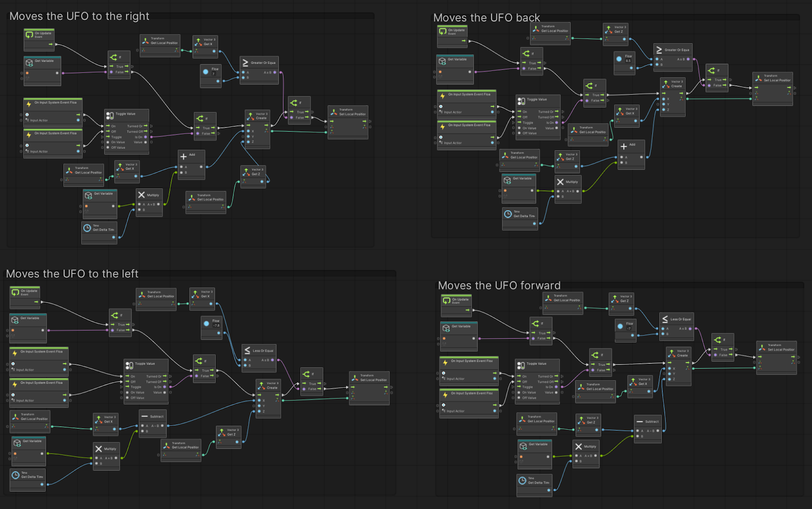 The UFO Movement Script Machine handles all of the UFO’s movement in the game. Inside the Script Machine are four graphs, which manage left, right, forward and backward movement.