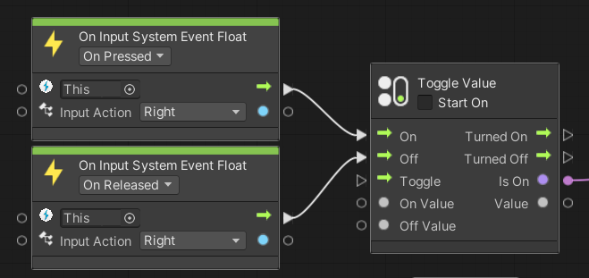 You’ll notice that there are two values to detect keyboard input: one for On Input System Event Float: On Pressed and one for On Input System Event Float: On Released. These nodes feed into the Toggle Value node, which allows the graph to detect the complete button press action.