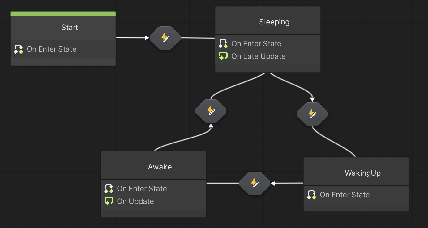 The farmer transitions back and forth between a few states: sleeping, waking up, and awake. Just as with the sheep, a State Graph was an appropriate solution to manage the farmer’s behavior.
