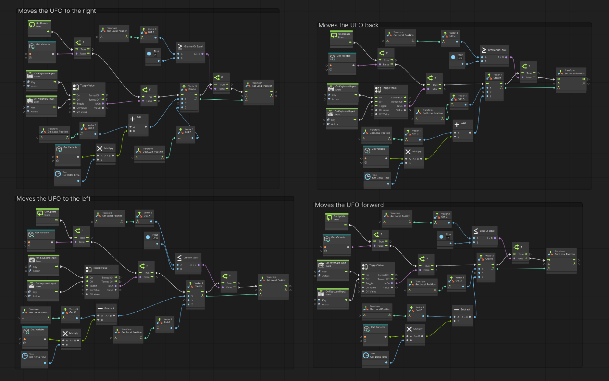 Although this game appears relatively simple, you may be surprised by the complexity of some of its visual scripts. Look at the visual script that manages the UFO movement, for example.