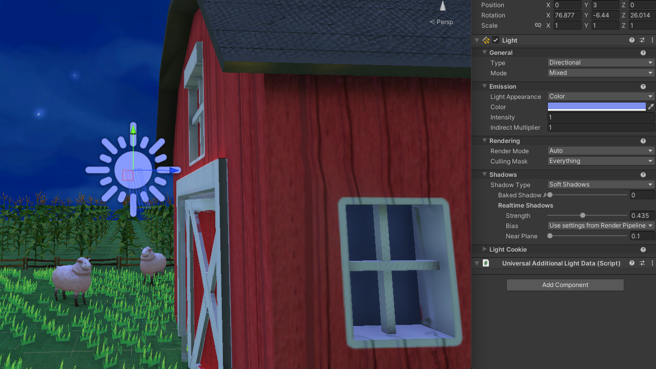 The one limitation that baked lighting has is that it doesn’t work for dynamic objects — that is, objects that animate or otherwise move in some way during the game. This limitation means the sheep and the farmer can’t make use of baked lighting. To account for this, the Modes of all directional lights in the game have been set to Mixed. Mixed lighting renders lighting data at runtime and can adjust as things in the scene change, but Unity will apply pre-calculated baked lighting to objects that already have lighting data.
