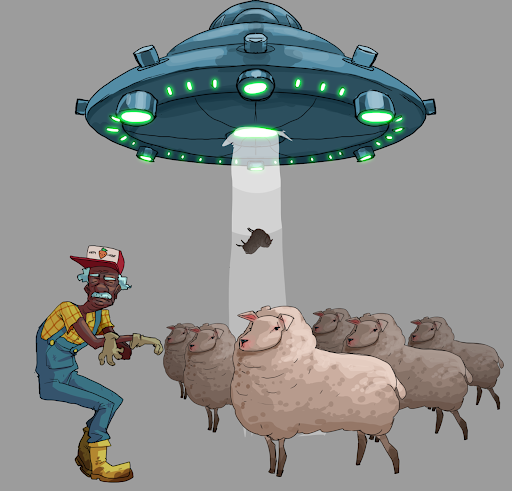 It’s clear that the poor old farmer has never been out this late past his bedtime: he keeps falling asleep in the field! Instead of taking the sheep from the barn, the aliens can use their tractor beam to snatch the sheep straight from the field.
