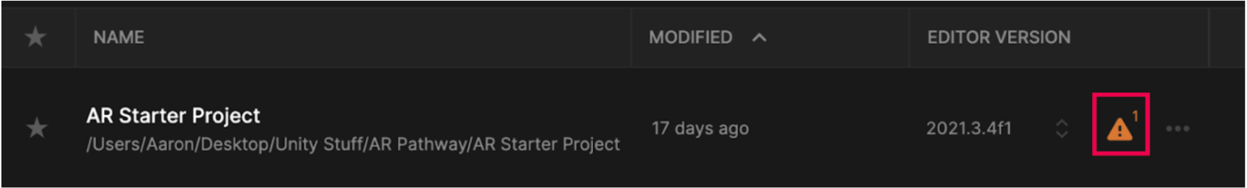 If you see a warning icon next to the Editor version of your project, that means you do not have the correct version of Unity installed (2022.3.1f1). You need to install the specific required version of Unity. Select the warning icon for more information.