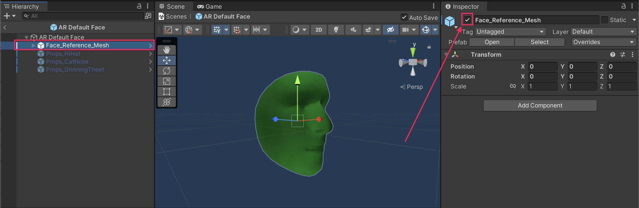 1. Make sure the AR Default Face prefab is open. If it isn’t, go to the Prefabs folder in the Project window and open it again.
