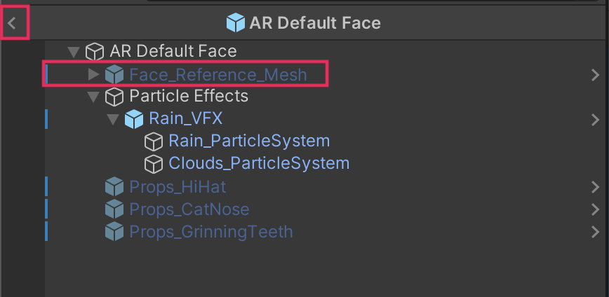 You probably don’t want to see that when testing the app on your device. Then select the left-facing arrow next to the AR Default Face prefab name in the Hierarchy window to exit prefab editing mode.