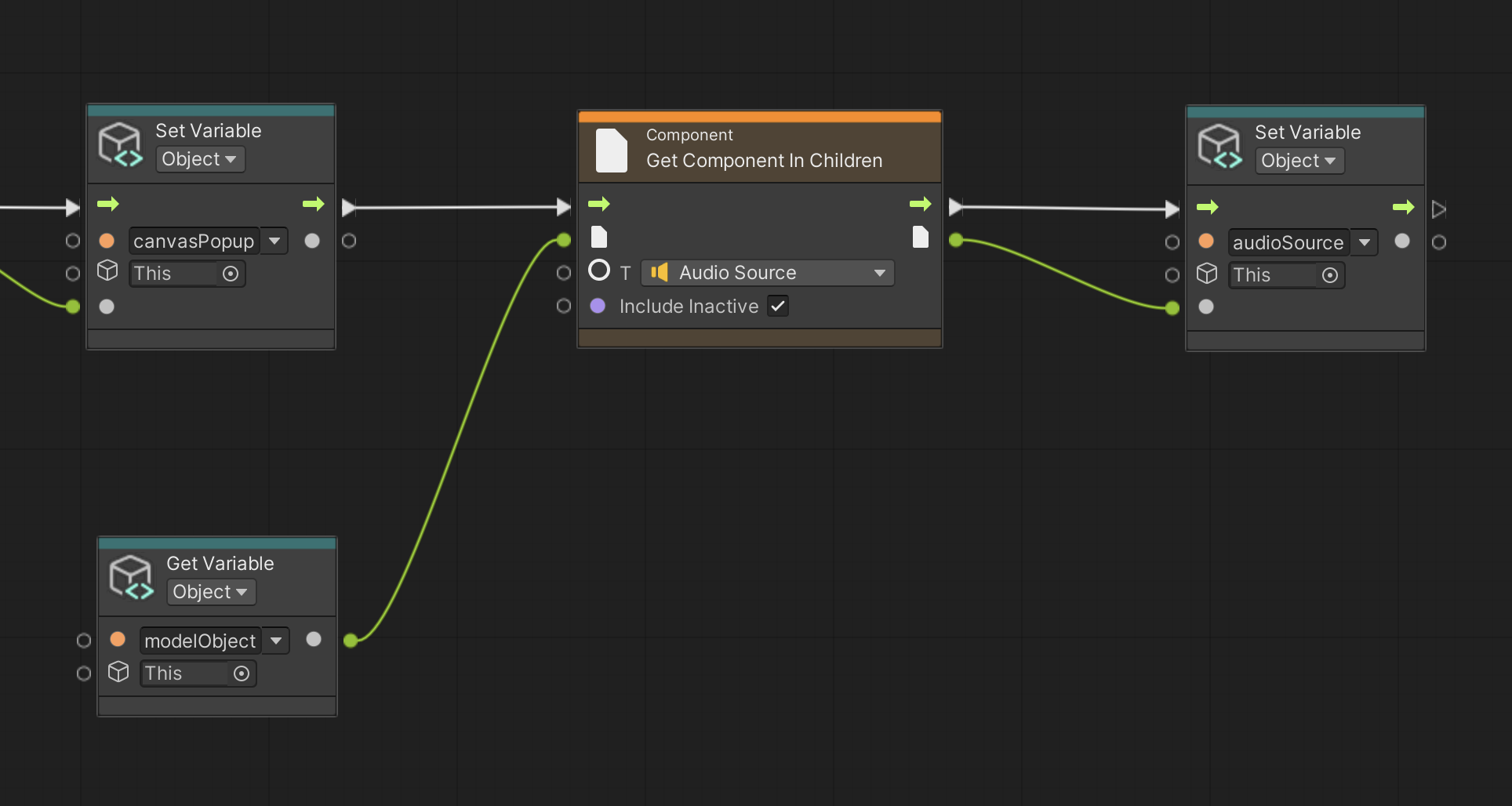 6. Add a Set Object Variable node to the end of your graph. Select audioSource as the GameObject. Connect the output type node to the bottom input node (without a label) of Set Variable.