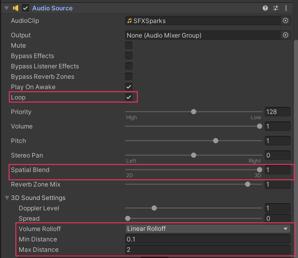 9. You will probably need to tweak the Min Distance and Max Distance properties of the Audio Source component as you get a feeling for the way spatial audio works. You might need to build and test a few times to get the sounds to play exactly the way you want.