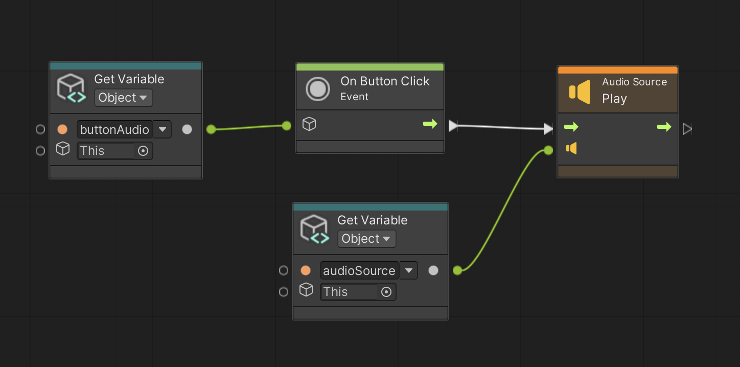 5. In the Graph Editor, add an On Button Click node and connect the Get Variable: buttonAudio node flow output to the input on the On Button Click node.