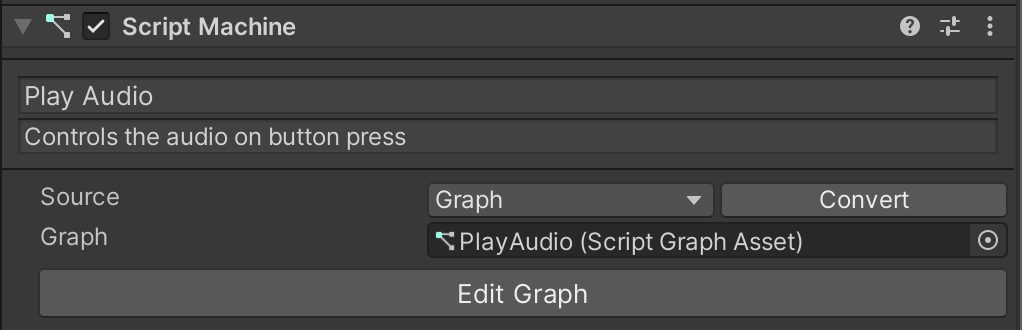 1. In the Hierarchy window, locate your VisualScripts GameObject and make a new Script Machine component named “PlayAudio”.