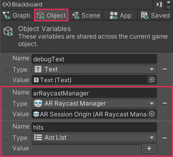 1. Go to the Object tab of the Blackboard. Click and drag the arRaycastManager and hits variables into the Graph Editor.
