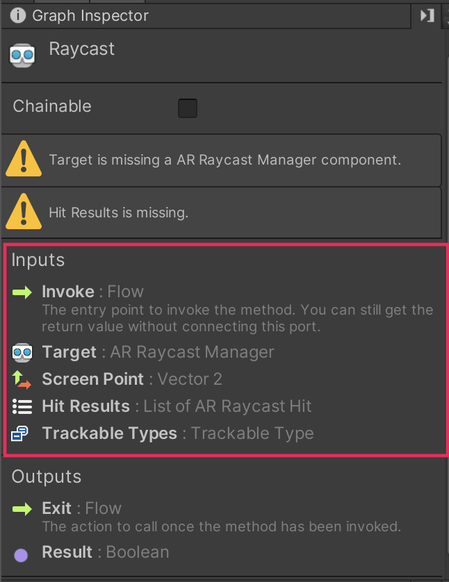 If you select the Raycast node and check the Graph Inspector, you’ll notice that the output is a Boolean — a true or false value indicating whether or not the raycast hit a plane or not.