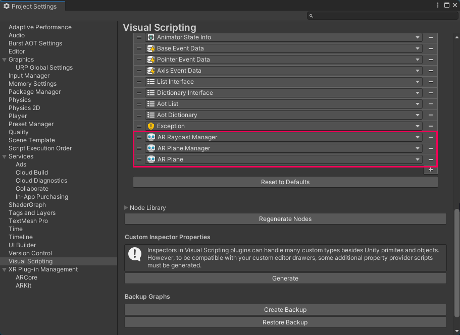 6. Beneath the list, select Regenerate Nodes to load the AR Foundation nodes into the toolset.