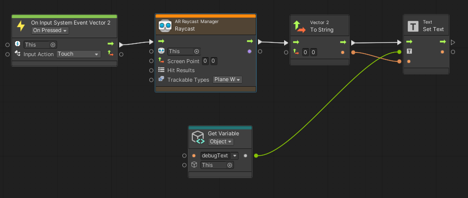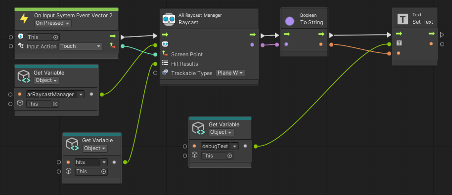 In order to complete this functionality, you will need to make use of the AR Raycast Manager: Raycast Visual Scripting node.