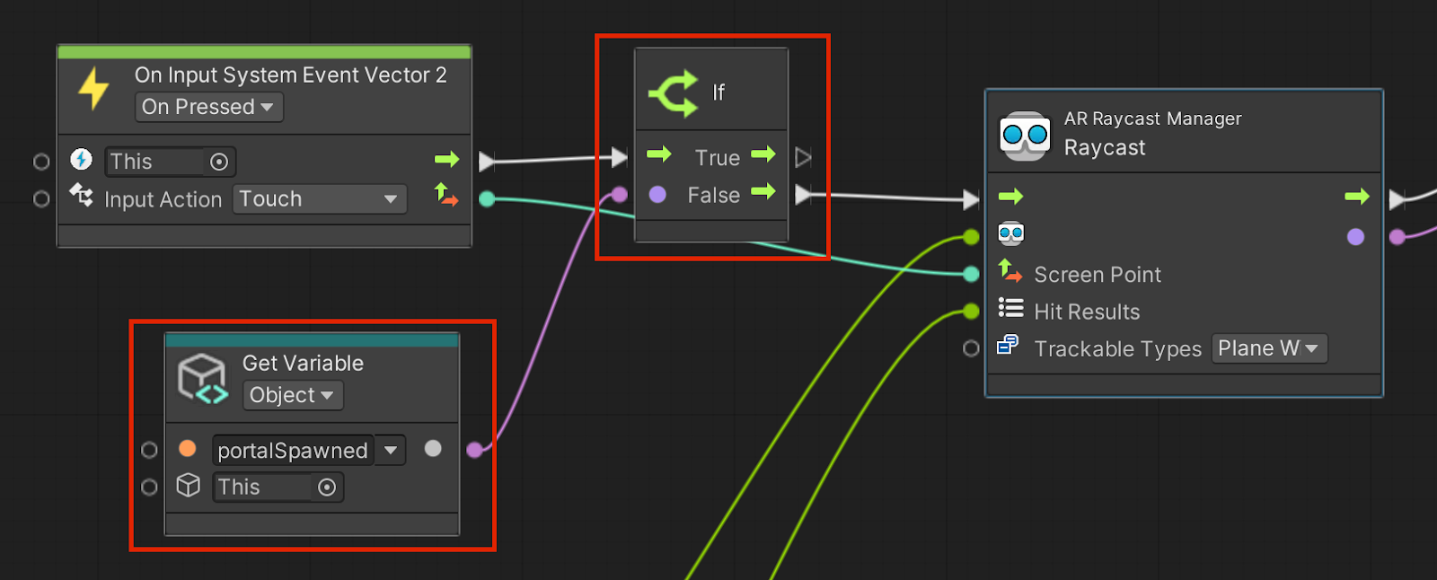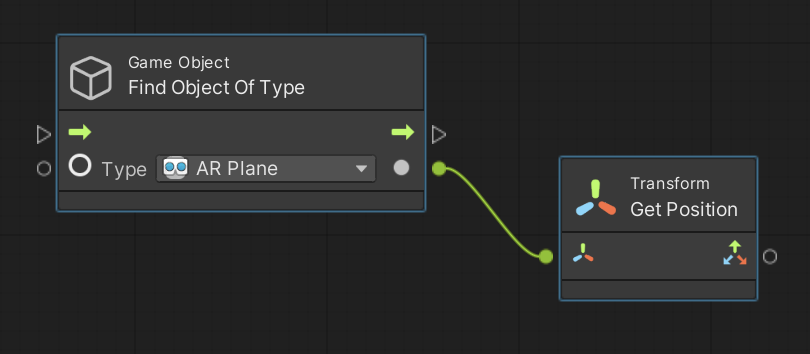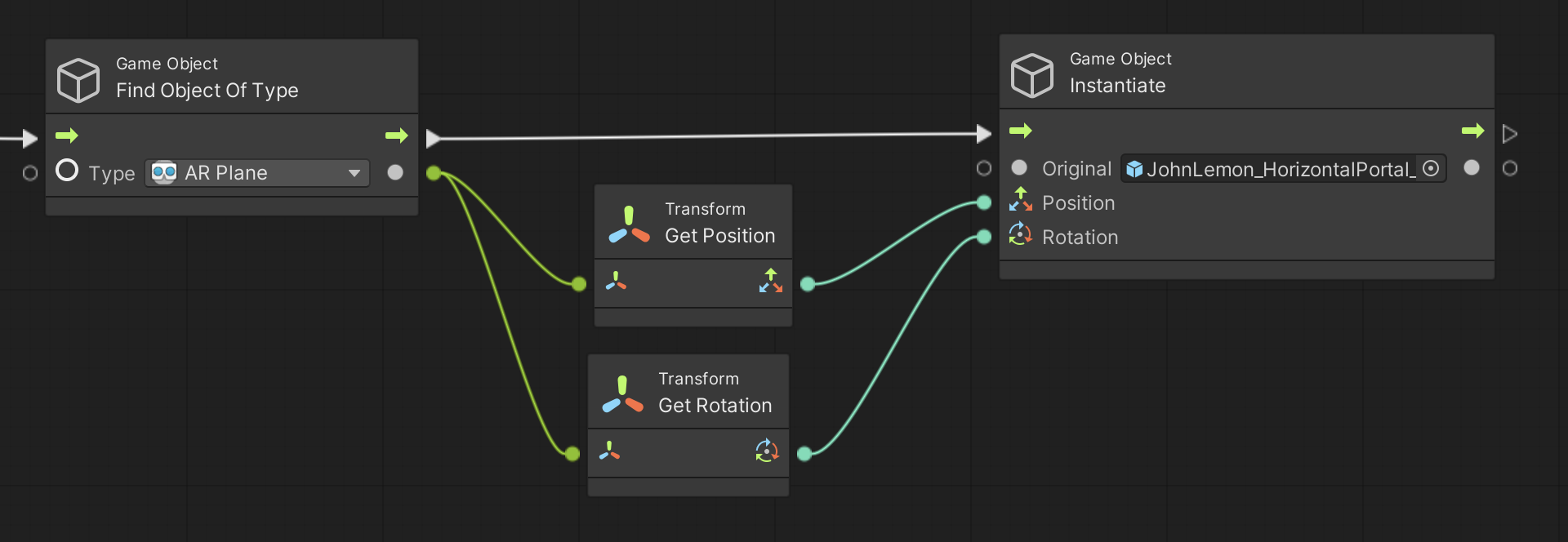 The goal is to position the portal at the same position as the plane. In order to get the position of the plane, you’ll use the Find Object Of Type node and the Transform: Get Position node. You can then use that same position when you instantiate the portal GameObject.