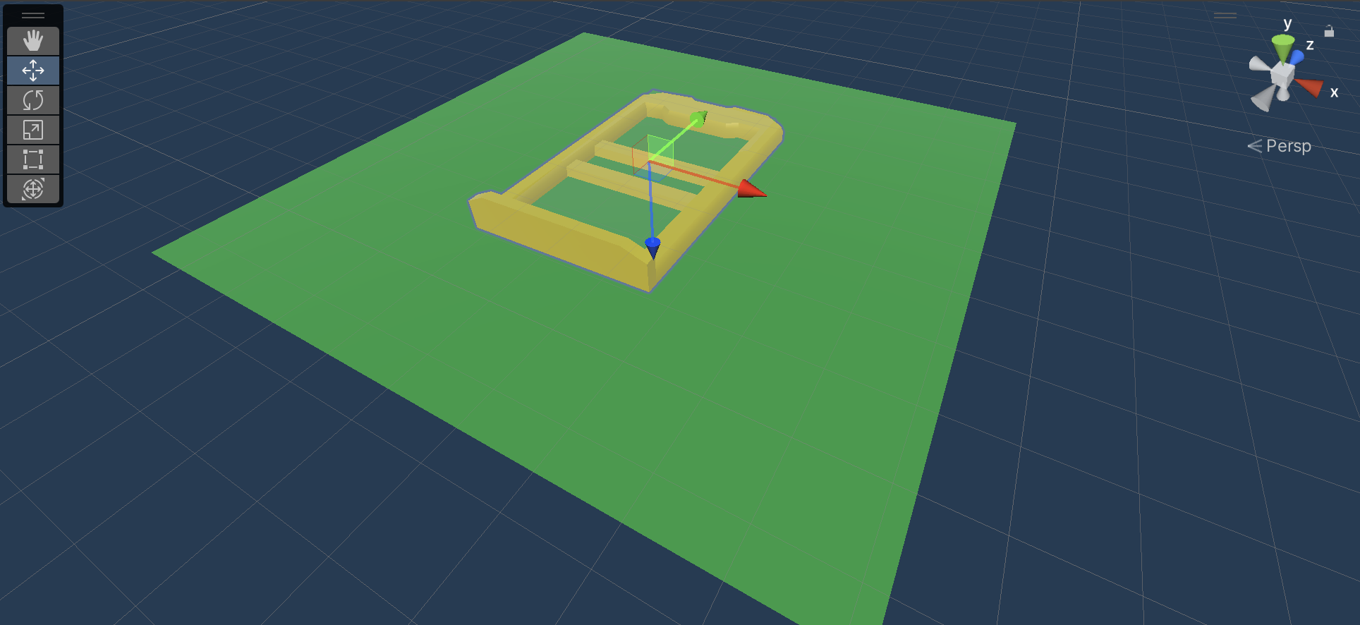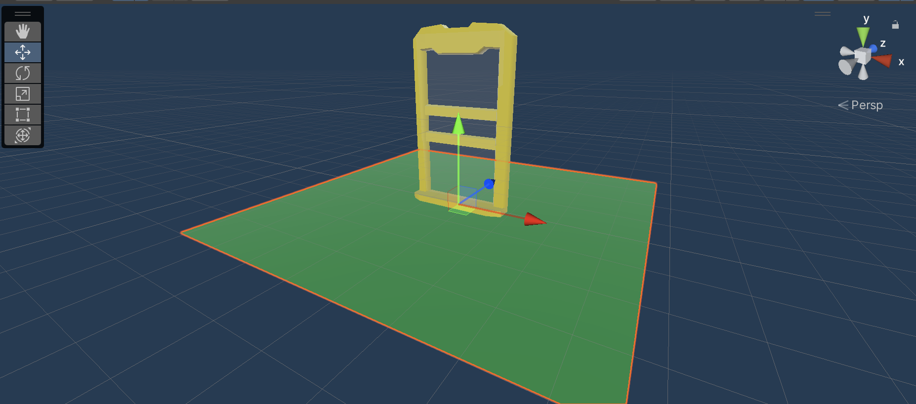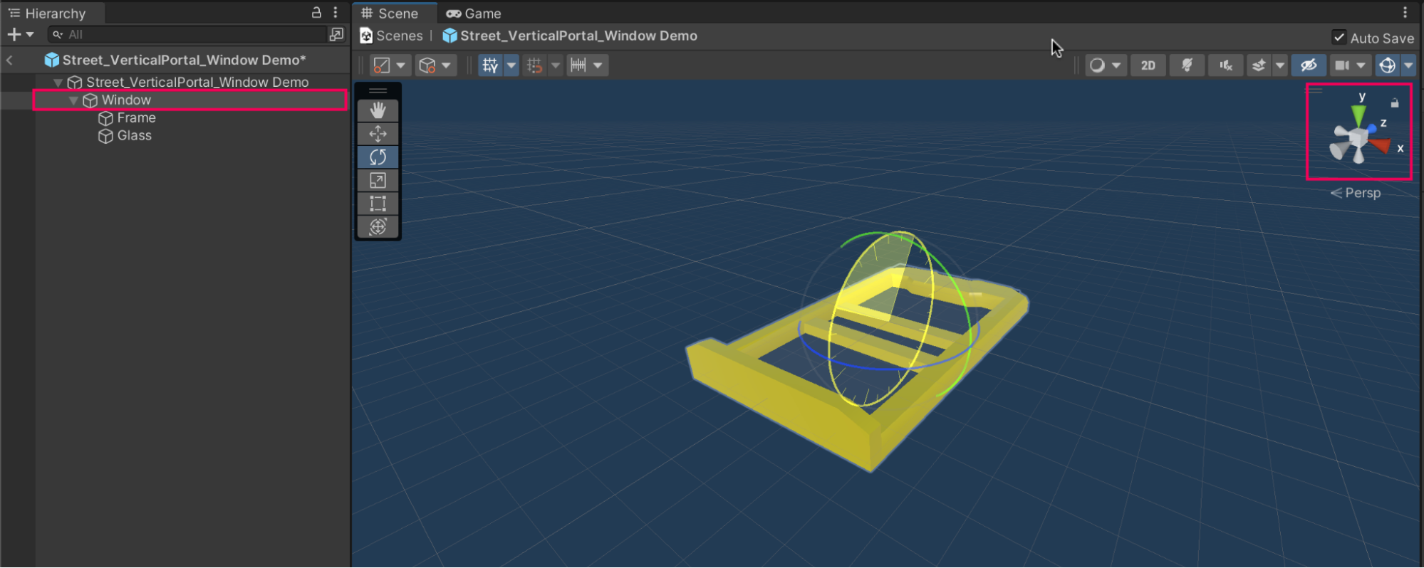 2. In the Hierarchy window, select the Window GameObject, then rotate it by 90 degrees so that it is facing upward in the Scene view. The outside face of the window should point in the direction of the green y-axis arm of the Scene gizmo and the top of the window should point in the direction of the blue z-axis arm.