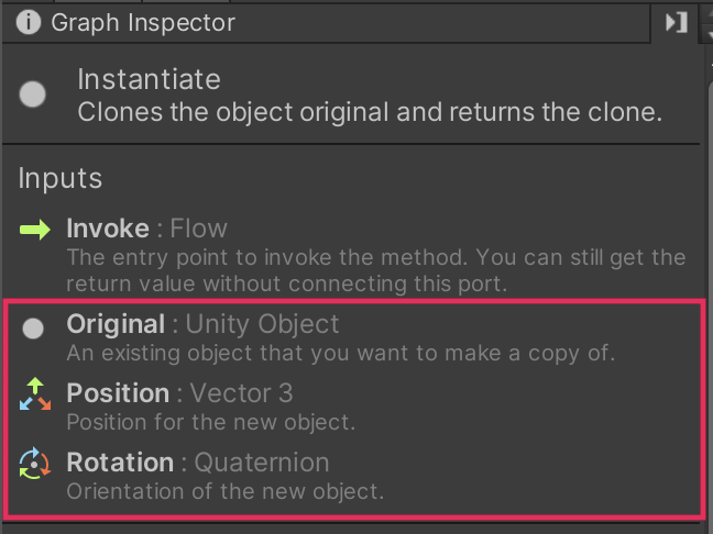 3. Add a new Game Object: Instantiate node and connect it to the end of the sequence. Make sure to select the Instantiate node with the three inputs: Original, Position, and Rotation.