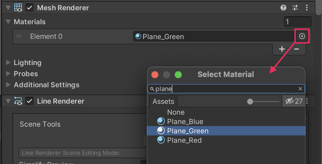 In the assets for this project, you were provided with simple materials for the AR Default Plane, like Plane_Green, Plane_Red, and Plane_Blue. You can use any of those three options, or you could make your own new material and use that instead. There is also a Line Renderer component on the AR Default Plane that controls the appearance of the plane’s outline – you can edit that too!