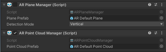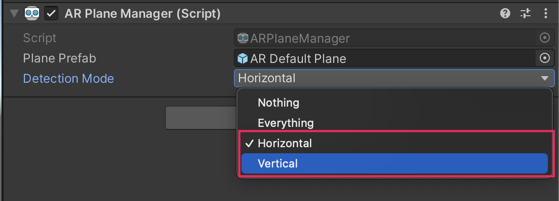 5. In the AR Plane Manager component, set the Detection Mode property to either Vertical or Horizontal planes.