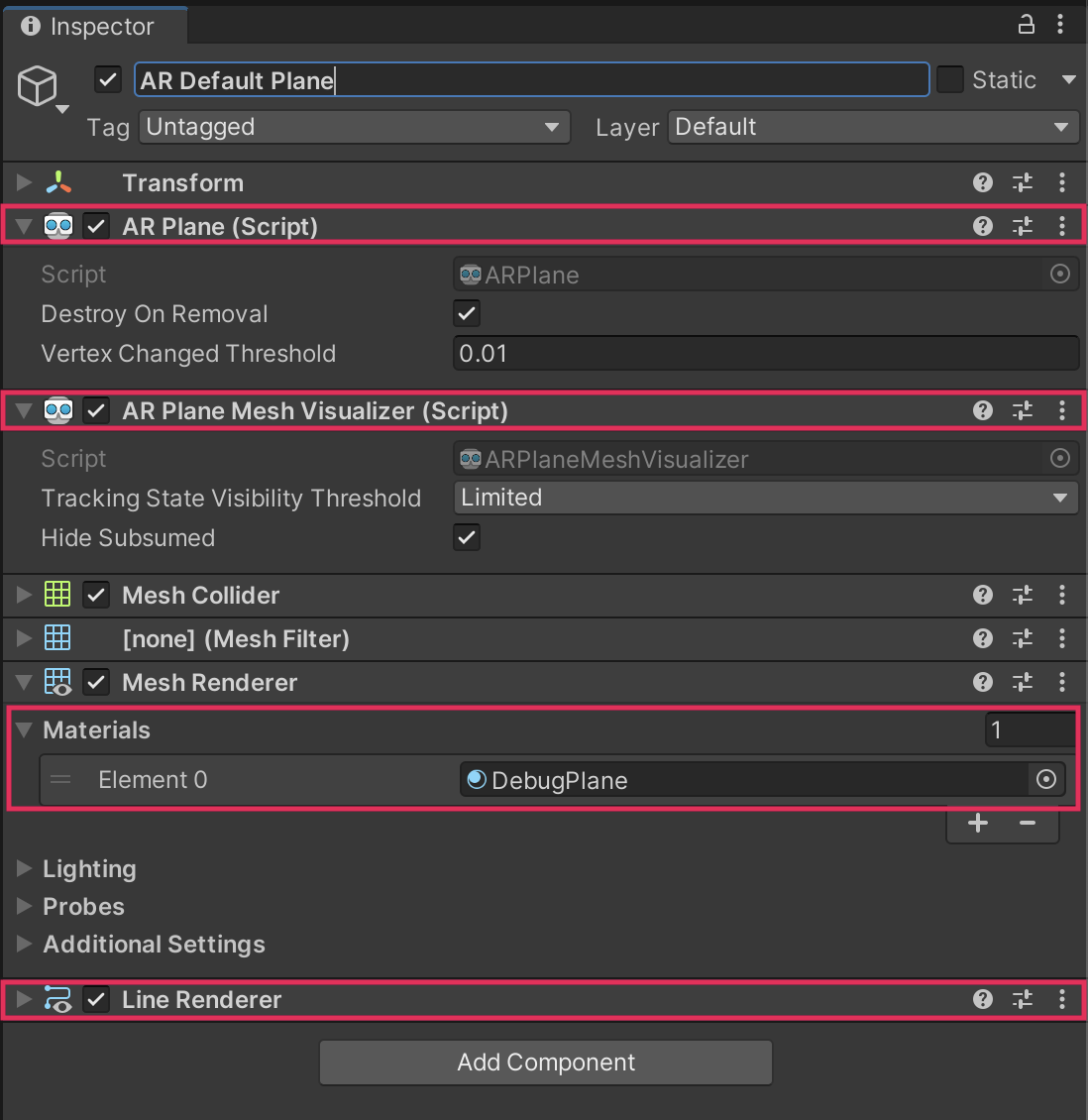 - The AR Plane Mesh Visualizer (Script) component handles the display of the material and outline of a detected AR plane.