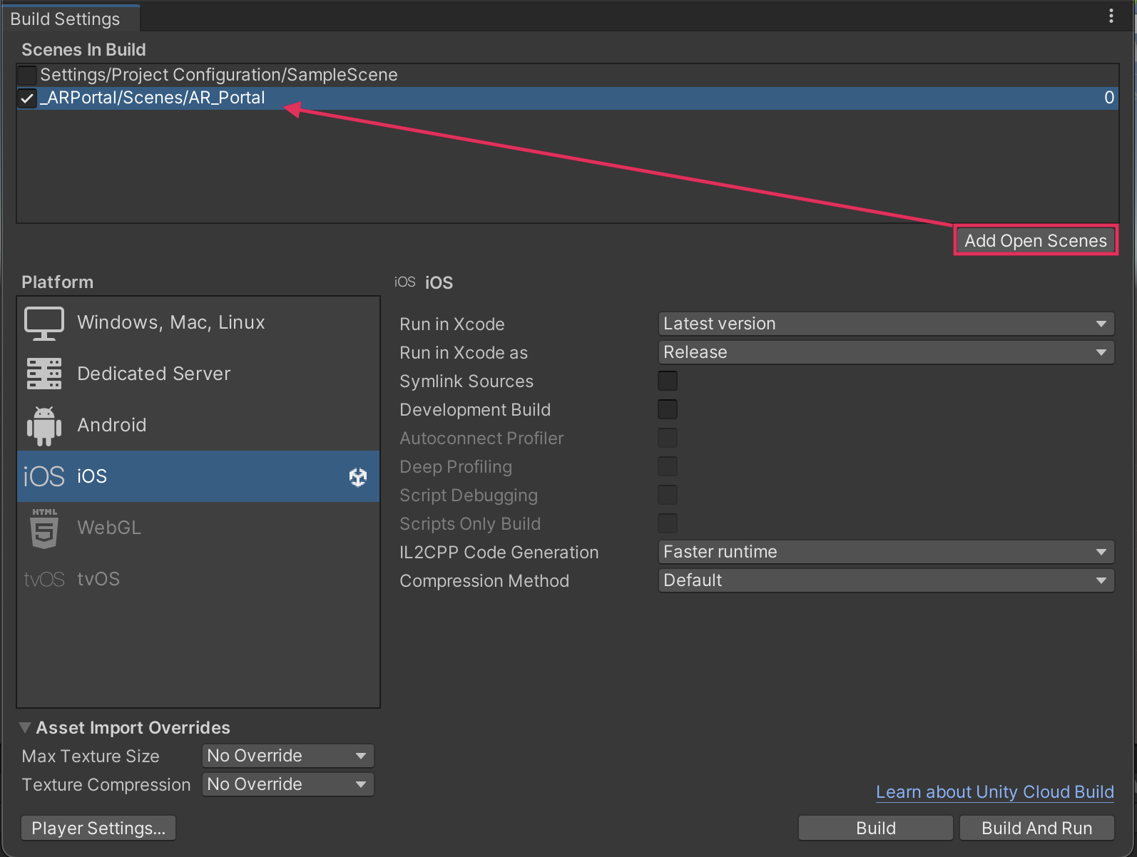 4. Select Add Open Scenes to add the current scene to the build. Deselect any previous scenes to make sure that they are not included in your new build.