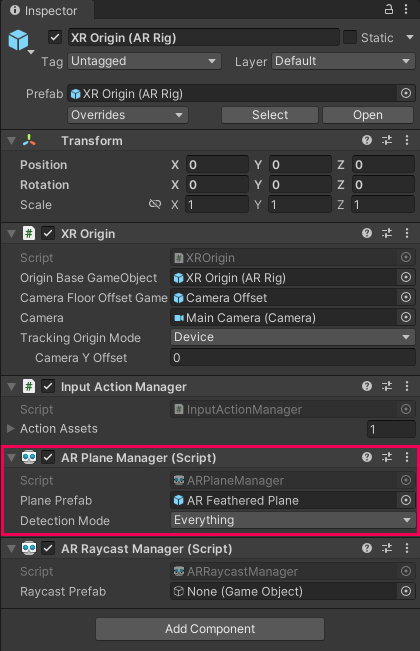 2. In the Inspector window, add the AR Plane Manager component.