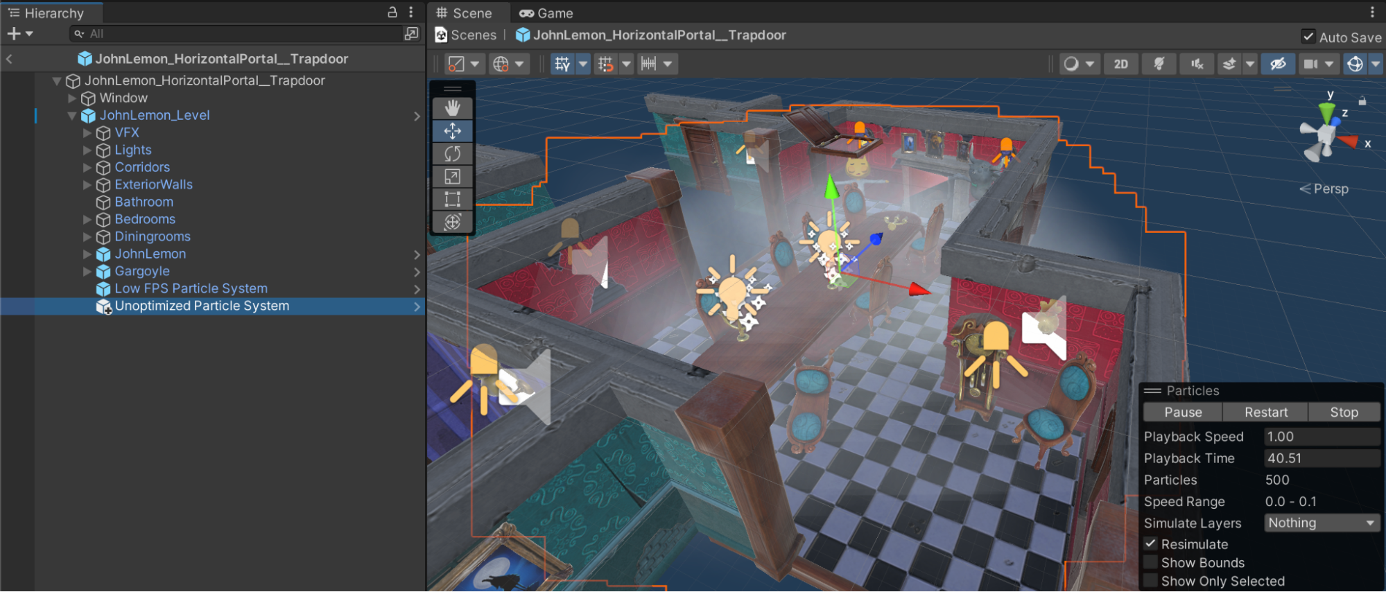 5. When you are finished testing, delete the Unoptimized Particle System GameObject.