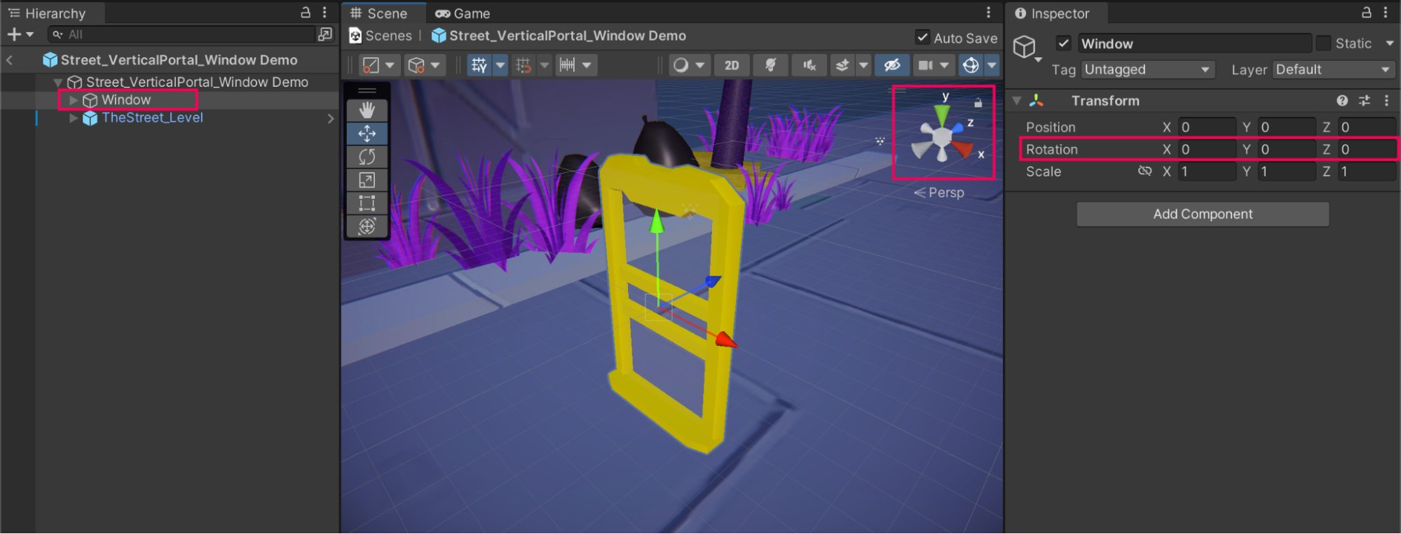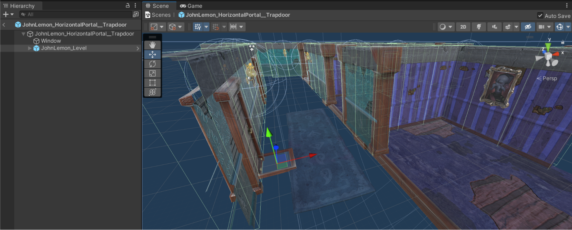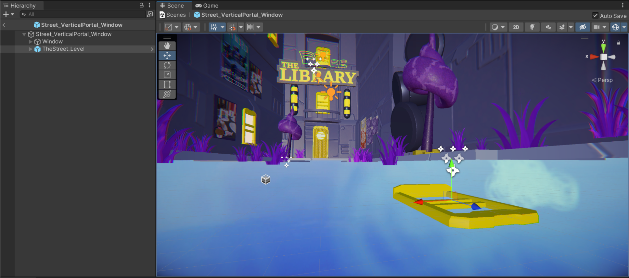 5. In the Hierarchy window, select the [Theme]_Level GameObject. Use the Move, Rotate, and Scale tools in the Scene view to reposition the level relative to the portal window.