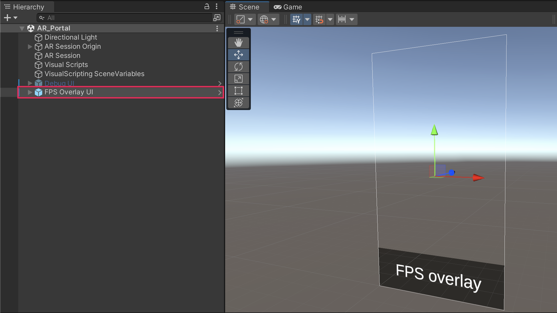 2. In the Project window, go to _ARPortal > Prefabs > Testing, then click and drag the FPS Overlay UI prefab into the Hierarchy window.
