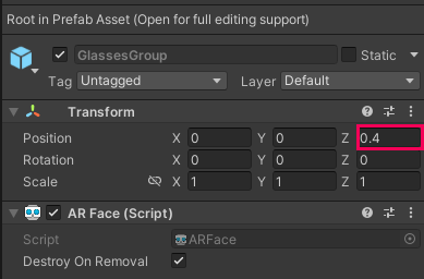 5. Select the GlassesGroup prefab in the Project window and change its Position property Z value to 0.4 as you did with the prefab in the Hierarchy window.