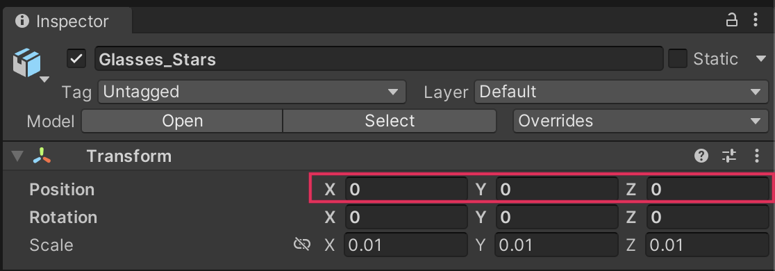3. In the Hierarchy window, select each pair of glasses and check that its Transform Position property is set to 0,0,0 in the Inspector window.