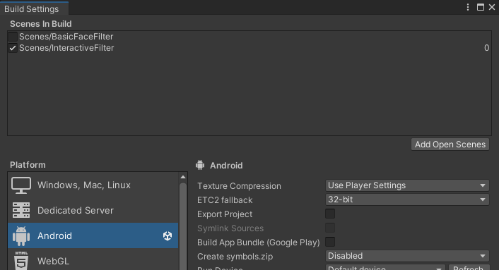 2. In the Scenes in Build section, select Add Open Scenes. This will add your new InteractiveFilter scene to the Scenes In Build list.