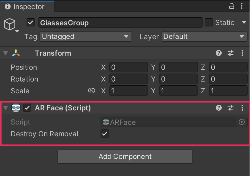 1. In the Inspector window, select the GlassesGroup, then select Add Component and add an AR Face component.