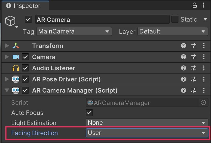 5. In the Inspector window, find the AR Camera Manager component and set the Facing Direction to User.