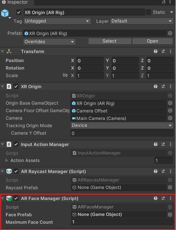 4. In the Hierarchy window, select the XR Origin (AR Rig) GameObject. Locate its AR Face Manager (Script) component in the Inspector window.