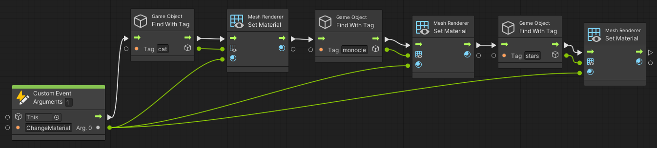 2. Connect the Arg. 0 output to the material inputs of all three Set Material nodes.