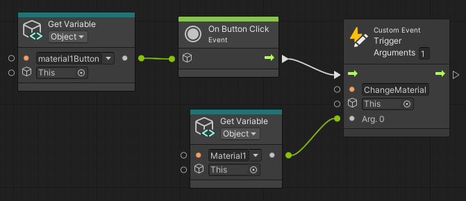 6. Connect the data output of the material1 Get Variable node to the Arg. 0 input of the Custom Event Trigger node.