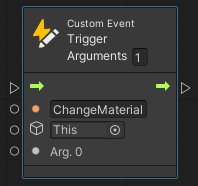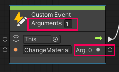 1. At the top of the ChangeMaterial Custom Event node, set the Arguments parameter to 1.