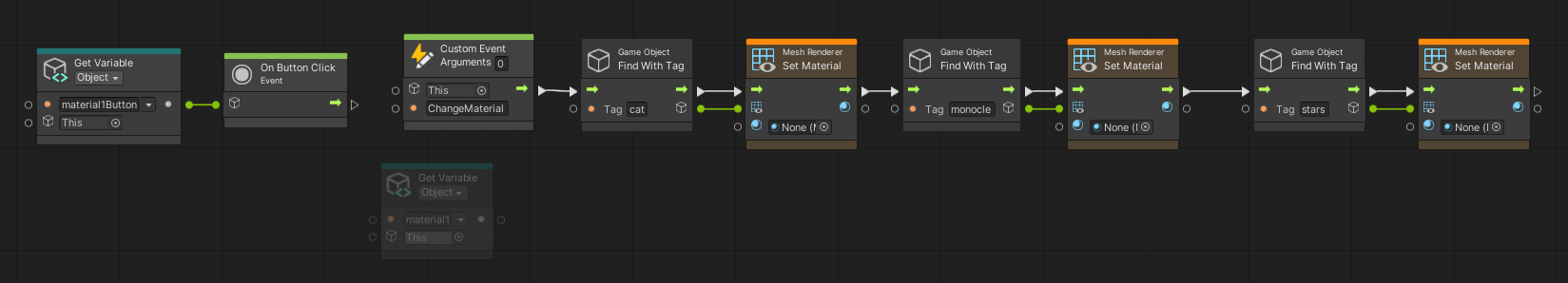 1. In the Graph Editor, select the material1Button Get Variable, On Button Click, material1 Get Variable, and ChangeMaterial Custom Event Trigger nodes (click and drag your cursor over them). Remember, you can zoom out if you need to.