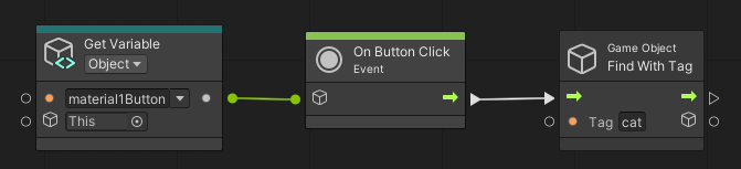 4. Connect the output (dot icon) of the material1Button Get Variable node to the input (cube icon) of the On Button Click node.