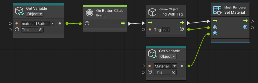 The Set Material node has two required data inputs: a reference to the GameObject it will change and the material to apply. You can pass the GameObject reference from the Find With Tag node, as you did previously with the Set Enabled node. For the material, you will reference the material1 variable you created.