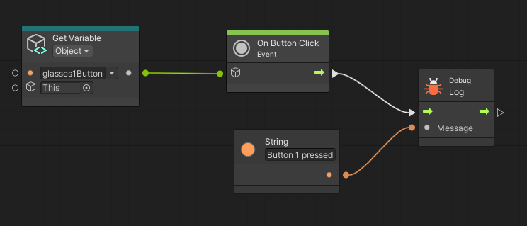 Your variable can now be used with the On Button Click node. Once you connect it, the On Button Click node will monitor for any presses made on the Glasses 1 Button.