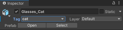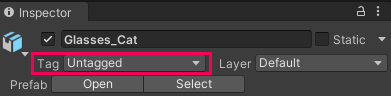 8. In the Inspector window, select the Tag dropdown and assign the appropriate tag to your glasses.