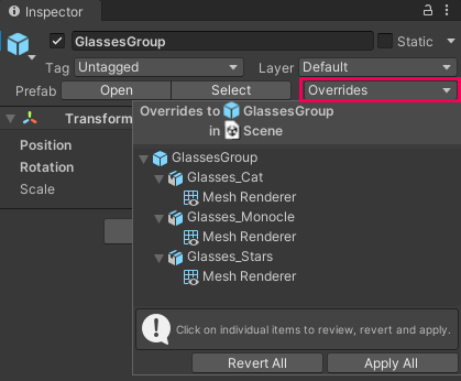 11. In the Inspector window, select the Overrides dropdown and select Apply All.