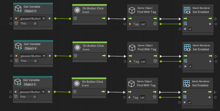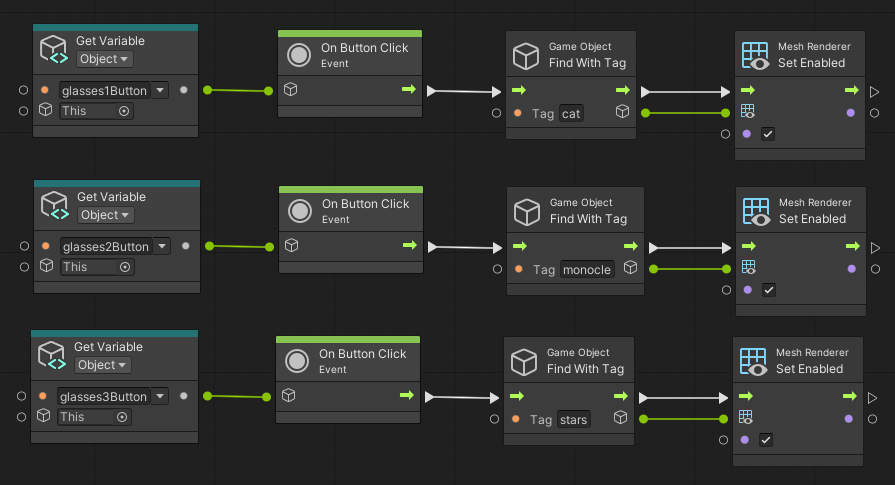 7. Set the second duplicated Get Variable node (in your third row) variable to glasses3Button.