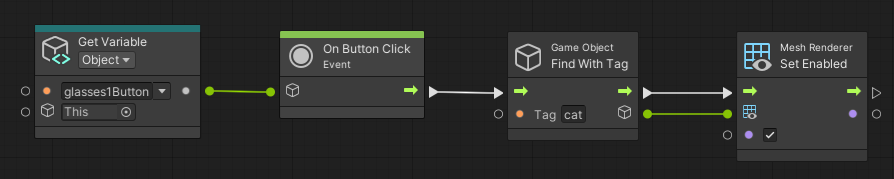 Now that the glasses GameObject is accessible to the script, you can enable its mesh renderer to make it visible when a user selects the button. You’re going to use a Mesh Renderer: Set Enabled node to implement this functionality.