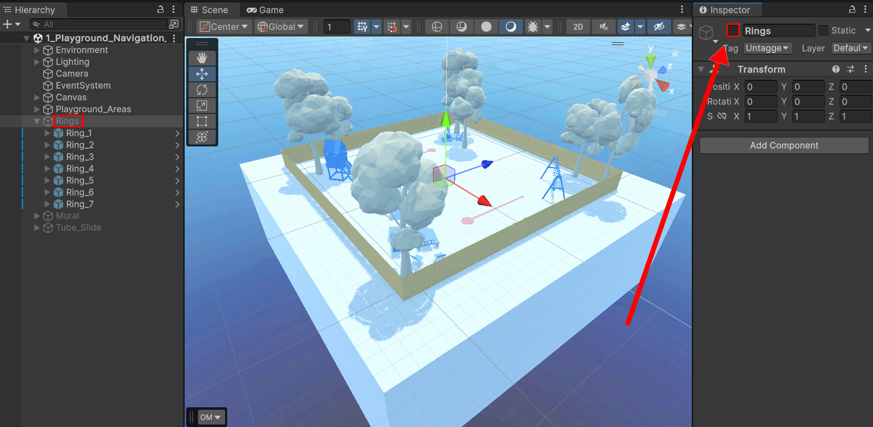 1. In the Hierarchy window, select the Rings GameObject.