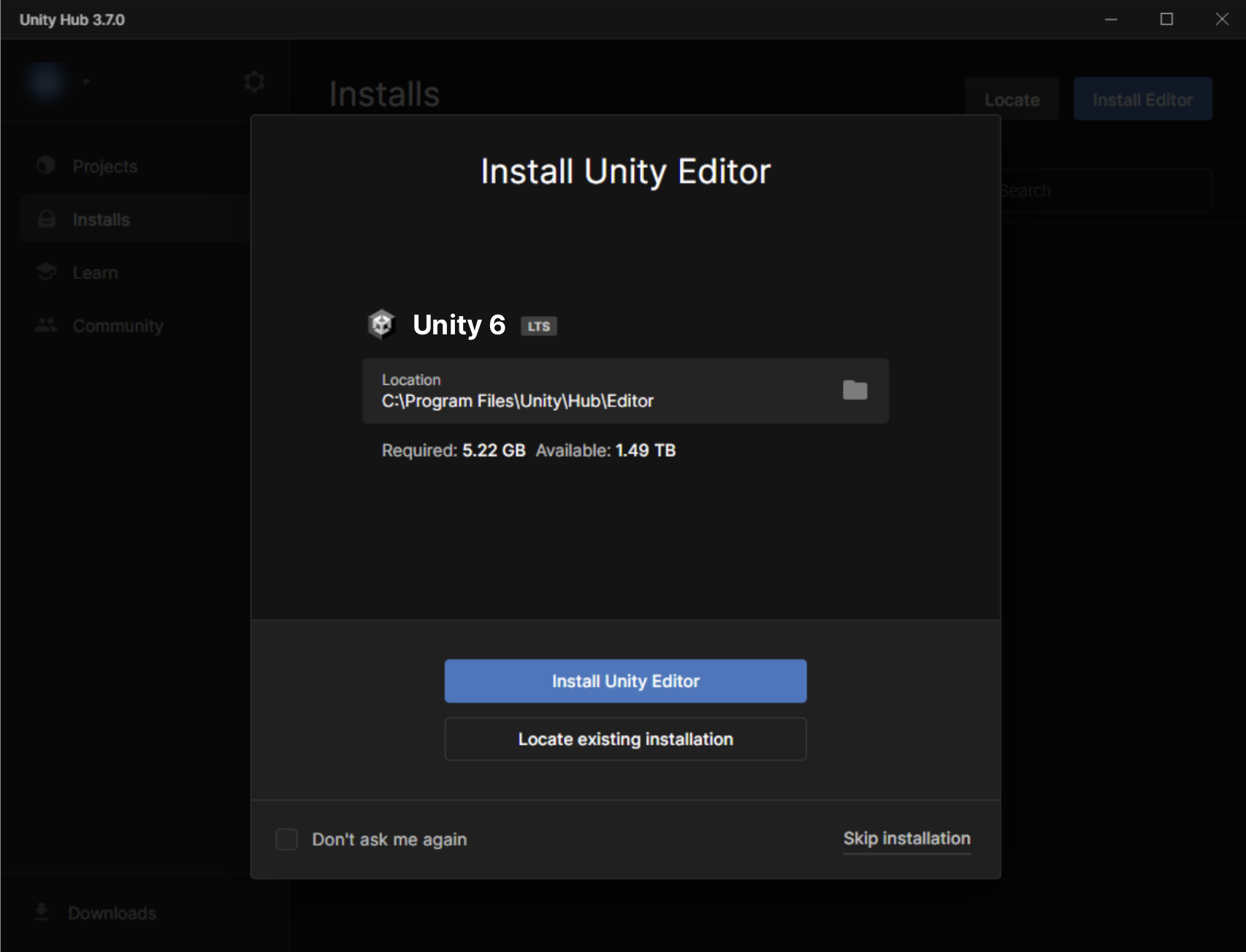 5. Select Install Unity Editor to download and install the latest LTS version of the Unity Editor.