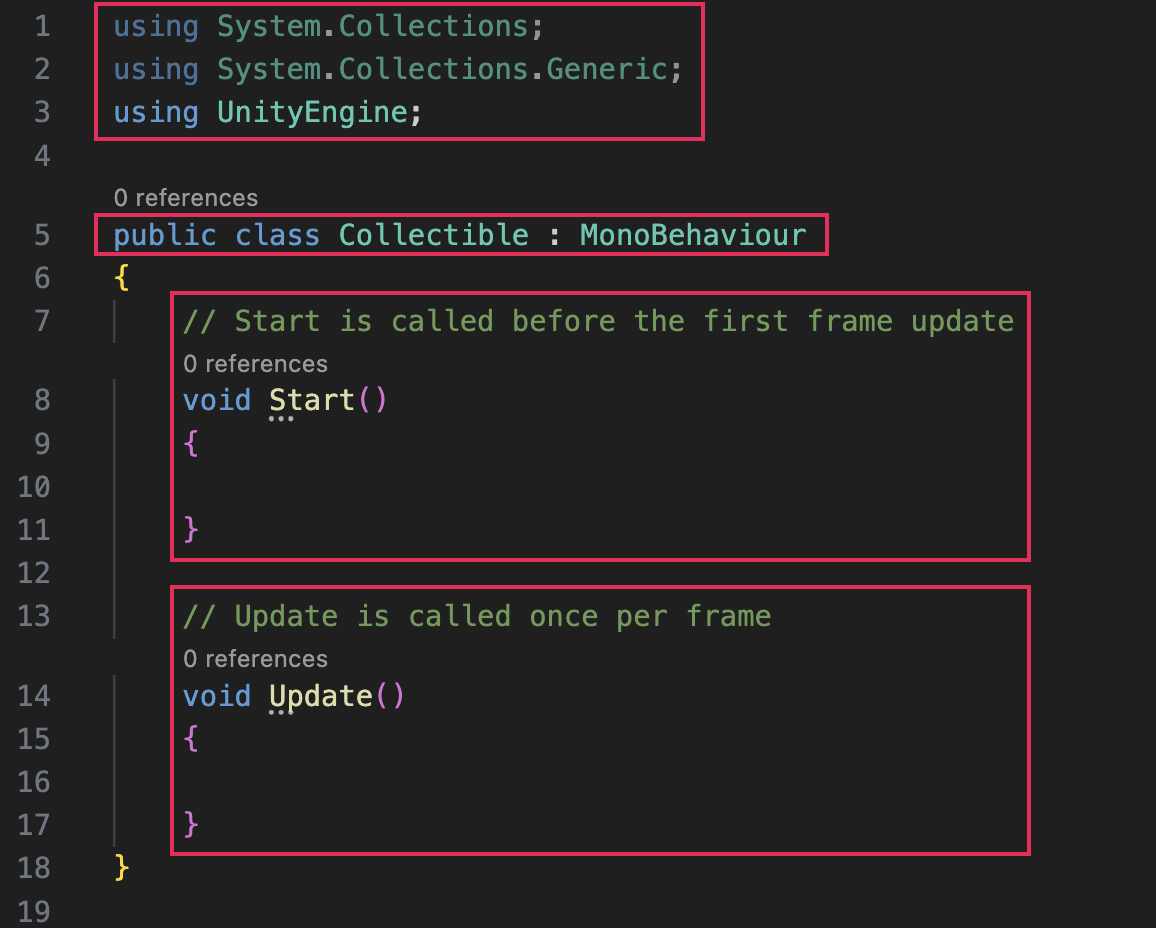 This defines the script as a public class named "Collectible" that inherits from Unity's MonoBehaviour class. MonoBehaviour is a required class for all GameObjects in Unity. This bit of code is what allows you to add your script as a component to a GameObject.
