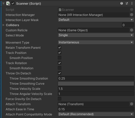 5. Save your script and look at the Inspector for the Scanner GameObject. Notice all of the familiar fields that now appear in the Scanner component, identical to the XRGrabInteractable component.